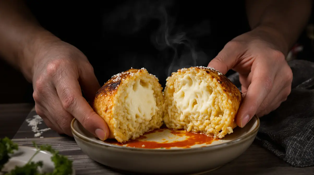 Le secret des arancini commence dès que le risotto refroidit. Au frigo, il se compacte, se tient mieux, devient facile à modeler. Ce qui était un plat crémeux se transforme en base parfaite pour façonner des boules.